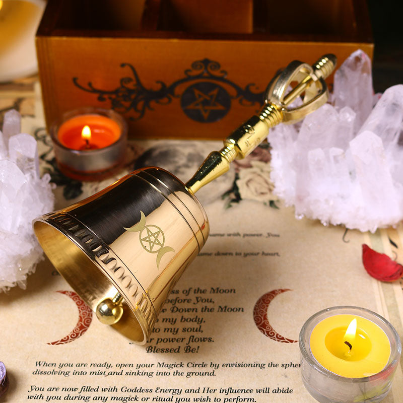 Invoke divine energy and mark sacred transitions with this beautifully handcrafted brass ceremonial bell, adorned with the powerful symbols of the pentagram and triple moon phases. The clear, resonant tone clears stagnant energy, calls in divine presence, and enhances your witchcraft rituals, meditation, and spiritual ceremonies.