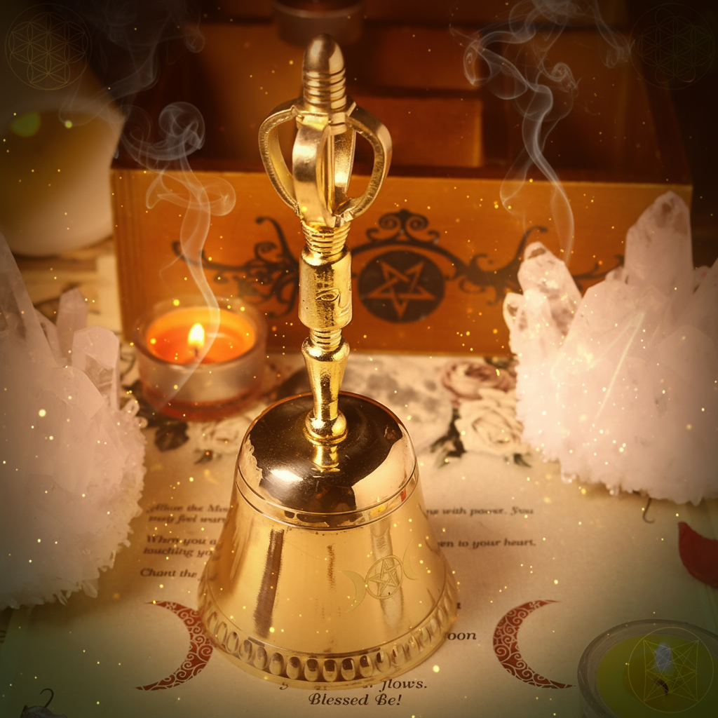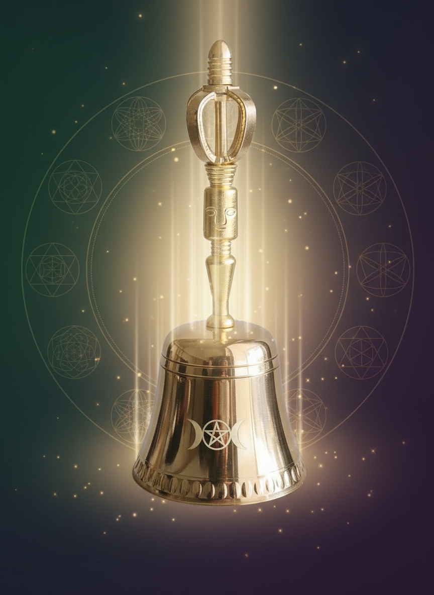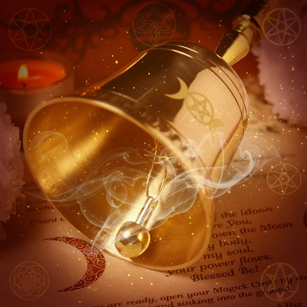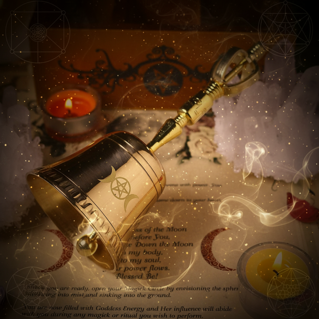 Sacred Ceremonial Bell with Triple Moon Goddess & Pentagram Symbols