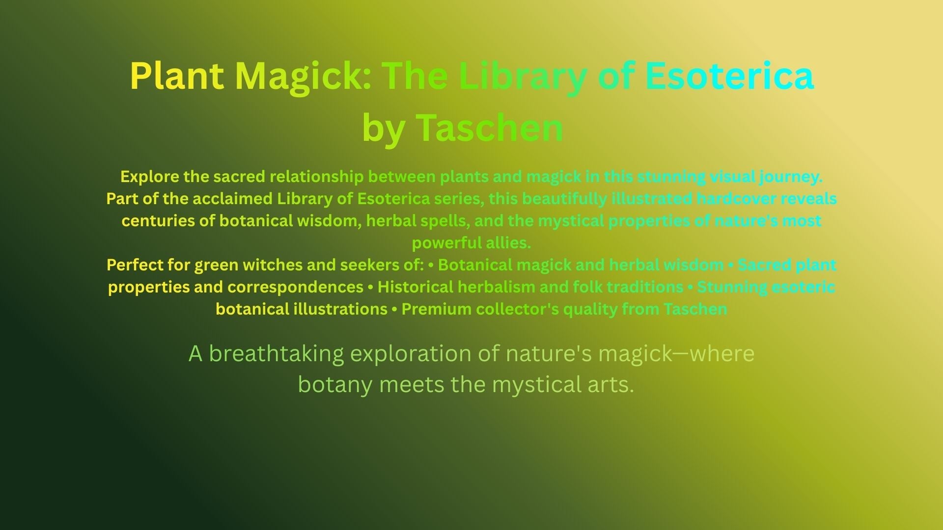 Celebrating the magick of the natural realm, Volume IV of The Library of Esoterica, delves into the symbolism, ceremony, and our ritual relationships with the botanical world. A visual journey through our interdependent evolution with nature, Plant Magick celebrates botanicals as creative muse - from ancient Greek sculptures to Renaissance paintings to visionary art inspired by psychoactive plants, cacti, and mushrooms. Our myths, beliefs, and shared stories are continually reflected in nature; purity represented by the white lily or spiritual awakening by the bloom of the lotus. Our joys and laments are mirrored in the cycle of the seasons, in the seed birthing sprout, or in the dead leaf falling softly from winter branches. Plants, trees, and flowers as signifiers of transition are also deeply embedded within rites of passage rituals across global cultures. Rose petals strewn along the wedding aisle mark the evolution into womanhood and marriage. A wreath of lilies stands sentinel over an open grave. A lover's bouquet awaits on the doorstep. The wooden May Day pole is circled by girls wearing crowns of woven daisies, celebrating the coming of spring. Birth, unions, and burials - cycles of joyful celebration and deep grieving, all are marked symbolically with herbs, flowers or branches of a tree - the integration of nature into ceremony our method of signifying catharsis. Since time immemorial, plants have also served as potent symbols within the religions of the world; Buddha attaining enlightenment under the Bodhi Tree, Eve plucking the Apple of Knowledge in the Garden of Eden. From root to vibrant blossom, Plant Magick explores the fertile, interconnected history between plants and people, the multitude of ways in which we embrace plants in spiritual ceremony, as healing medicine, as creative muse and as gateways into deeper explorations of consciousness.